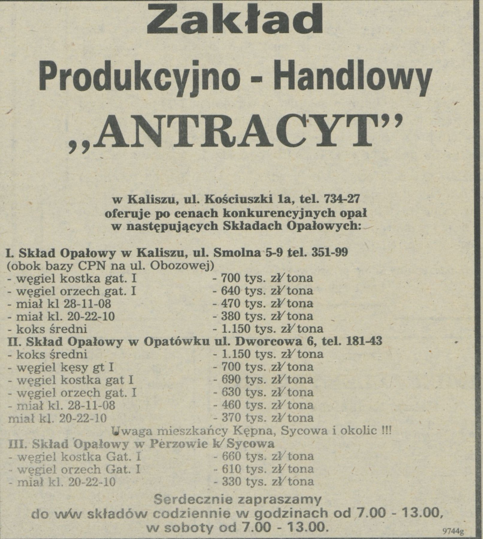 Ogłoszenie z 8 listopada 1991 r., które ukazało się w 45. numerze "Ziemi Kaliskiej", dotyczące sprzedaży opału przez Zakład Produkcyjno-Handlowy "Antracyt" w Kaliszu. Zakład oferował na sprzedaż m.in. węgiel, miał oraz koks.